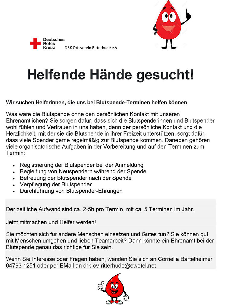 Der DRK-Ortsverein Ritterhude e.V. ist eine engagierte, rein ehrenamtliche Gemeinschaft von Bürgerinnen und Bürgern mit vielen Angeboten für Jung und Alt.